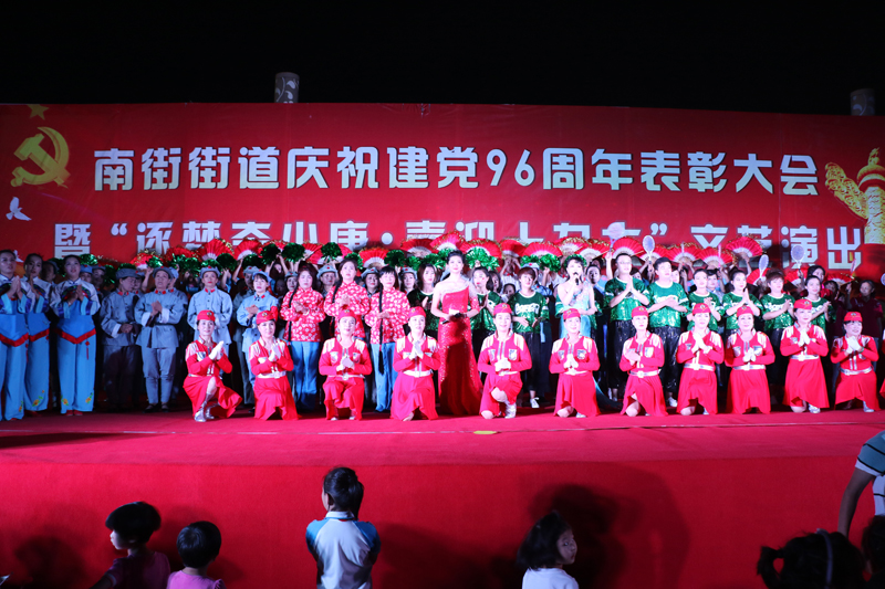 为庆祝党的96华诞,重温党的光辉历程,继承党的优良传统,6月29日晚,南街街道在和谐广场召开庆祝建党96周年表彰大会暨“逐梦奔小康,喜迎十九大”文艺演出,向伟大的党献上诚挚的祝福。